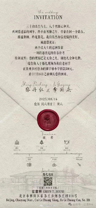请柬文案为:“三十功名尘与土,八千里路云和月。两列错过站的列车,终于在耳顺之年,停靠在同一个站台。踏遍荆棘,终见繁花。我们依然相信爱情的美好。