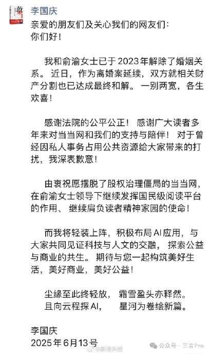三言Pro向李国庆求证,暂未获得回应,但接近李国庆人士向三言Pro确认了婚讯。(三言科技)
