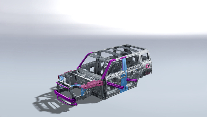 车身侧面线条方正硬朗,前后翼子板采用宽体设计,配备隐藏式门把手与车顶行李架。车尾部分,竖置式尾灯设计与硬派越野车型一脉相承。尾门采用侧开式结构,并搭载电吸功能,尾门外挂「小书包」,内部配有网袋分区,方便收纳。排气系统则采用隐藏式布局,进一步凸显运动属性与整车的力量感。