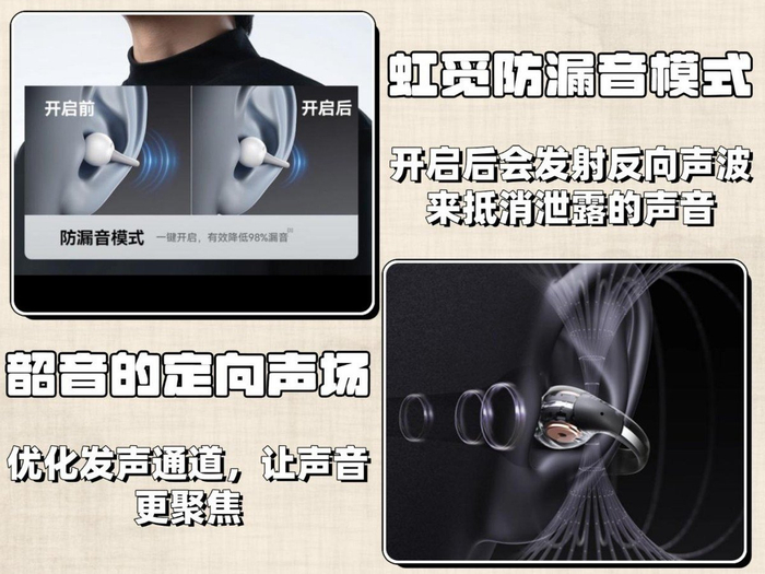 耳夹式耳机想彻底解决漏音不太容易,因为它们大多是是非封闭式设计,声音难免会从缝隙里跑出来,现在市面上几乎所有耳夹式耳机都有这个问题。所以大家选的时候,可以重点看它们的防漏音方案。像虹觅自己研发的防漏音模式,还有韶音的定向声场技术,这两种在行业里的评价都不错,能有效改善漏音情况。