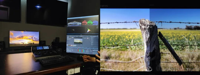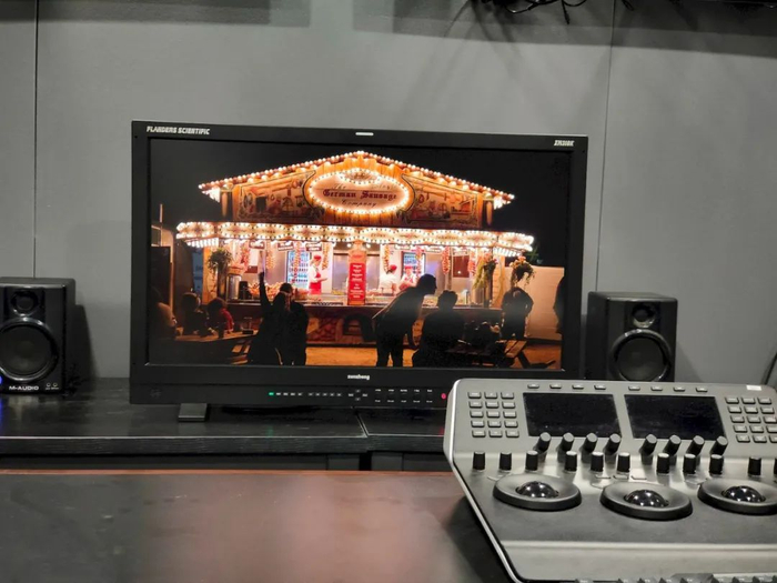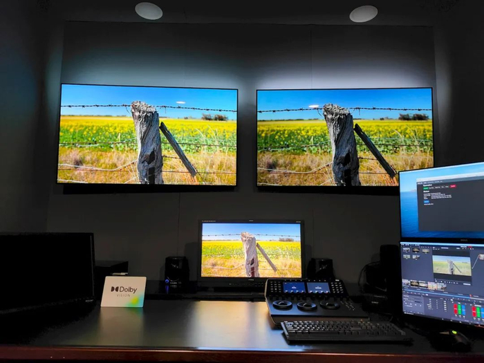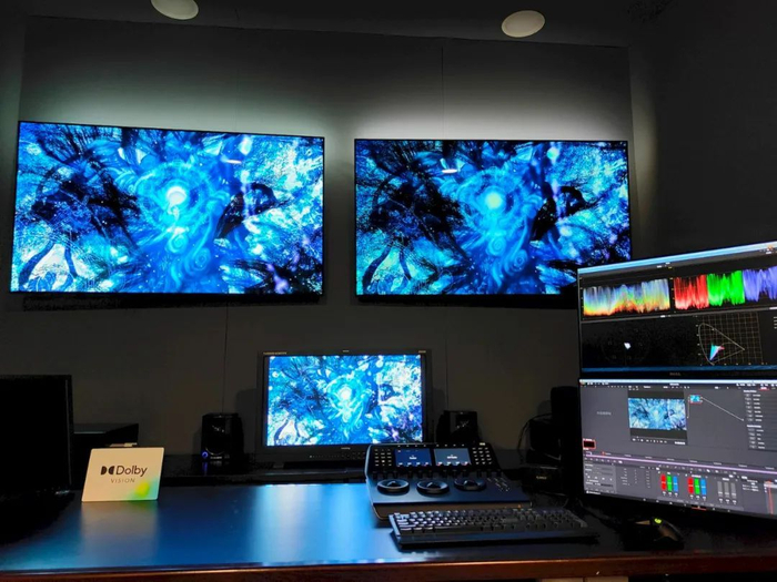8、很显然,全屋中间的那个3000尼特专业彩监用来保证“杜比视界”的画质上限,而右后的那台仅有100尼特的液晶电视则是画质下限。至于那台600尼特的电视机,则是调色师通常希望普通消费者能够在家里看到的水准。杜比自家有一套调色映射工具,能够让这几款屏幕显示同一个画面,并能够分别或者联动进行调节。这样,视频制作者(调色人员)能够很精确的掌握最终呈现在观众面前的画面效果(包括亮度、反差、色彩以及由此形成的画面质感)。