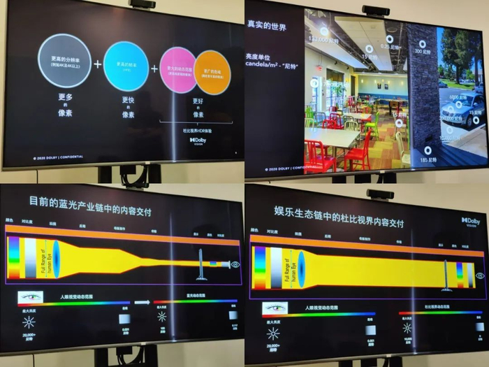 2、先说杜比视界。大家可以仔细看看这四张图:左上角是说明“杜比视界”是作什么的。它们不考虑画面的分辨率和帧率问题,它们只考虑画面如何获得更大的动态范围(明暗)以及更广的色域(颜色)。事实上,杜比视界是一种HDR工具,其目的是尽可能减少传统SDR视频制作时对亮度和色彩的损失,尽可能的还原接近人眼的画面效果。用现场工程师的话来说,就是“创造真实”、“还原真实”!