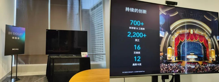 4、前几年我来杜比访问时,他们放的电视机是索尼和长虹的。这次他们拿来给我们做杜比视界、杜比全景声演示的居然是一台小米大师OLED!至于效果大家可以想见:确实画面对比度和色彩饱和度都非常出色。尤其是在播放了一段刘德华、刘青云主演的《拆弹专家2》片段后,工作人员说唯有这样的画面表现才让电影制作方的“钱没有白花”——画面中暗部的层次与高亮的火花细节都历历在目,我感觉比自己在影院看到的效果更好更清晰。同时,这台电视也自带杜比全景声功能。在仅靠自带扬声器的前提下,居然能有不错的环绕声效果,确实出乎我的预料;