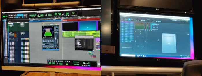 7、接下来是真正进入传说中的“杜比实验室”——今天主要是看“杜比视界”调色实验室和“杜比全景声”调音实验室。这两个厅我也是第一进入,所以还是挺开眼界的。杜比视界实验室里最中间位置上,是一台尺寸不大但号称能达到3000尼特亮度的专业监视器(售价数十万),旁边还有两台小一点显示器用来进行软件操作,背后墙壁上则有两台大电视一左一右摆放。这两台电视分别是能达到600尼特的HDR电视和100多尼特的普通液晶电视;