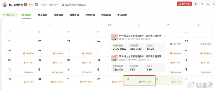 【董明珠孟羽童同框直播,带货销售额达500万元】5月23日晚,格力董事长董明珠和前秘书孟羽童一同现身“格力明珠精选”直播间进行直播带货。这是孟羽童离开格力电器后两人首次同框“破冰”。董明珠孟羽童二人同框当晚,格力直播间流量迎来爆发性增长。飞瓜数据显示,当晚“格力明珠精选”直播间观看人次达到292万,巅峰在线人数超过3万人,带货销售额高达500万元。带货成绩一度登上“大家电榜”第1名。对比之下,该直播间日常在线人数仅有40人左右,单日销售额普遍在50万元左右。(蓝鲸新闻)