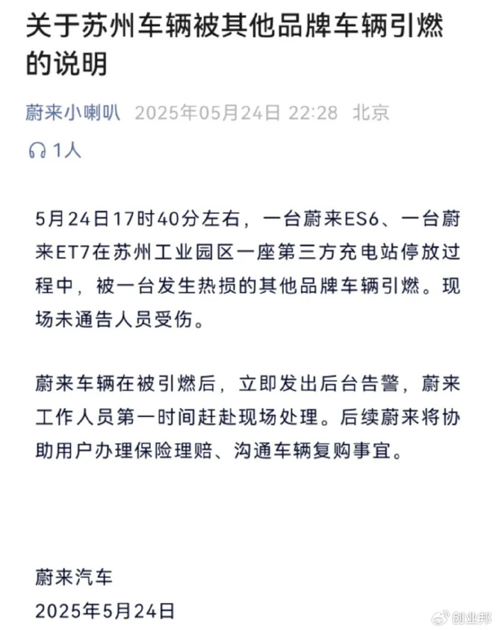 【两辆车在充电站起火燃烧,蔚来回应:是被其他品牌车辆引燃】近日有博主爆料称,苏州工业园区某充电站多辆汽车起火,涉事车辆包括蔚来等品牌。5月24日晚,蔚来官方微信公众号“蔚来小喇叭”发布情况说明:5月24日17时40分左右,一台蔚来ES6、一台蔚来ET7在苏州工业园区一座第三方充电站停放过程中,被一台发生热损的其他品牌车辆引燃。现场未通告人员受伤。蔚来车辆在被引燃后,立即发出后台告警,蔚来工作人员第一时间赶赴现场处理。后续蔚来将协助用户办理保险理赔、沟通车辆复购事宜。(每日经济新闻)