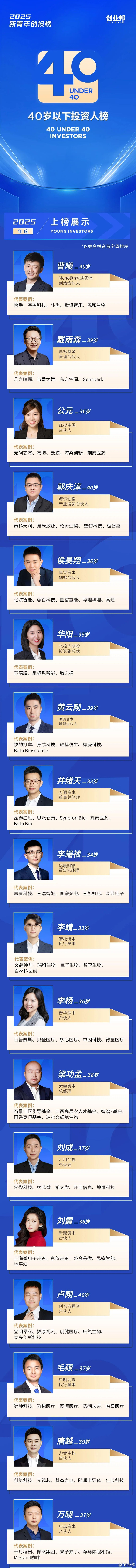 今年3月创业邦正式启动2025年度 “40岁以下投资人” 榜单报名,本次评选活动结合申报人在综合影响力、投资业绩和退出业绩三大维度的表现进行评审,最终评选出 “40岁以下投资人” 榜单。