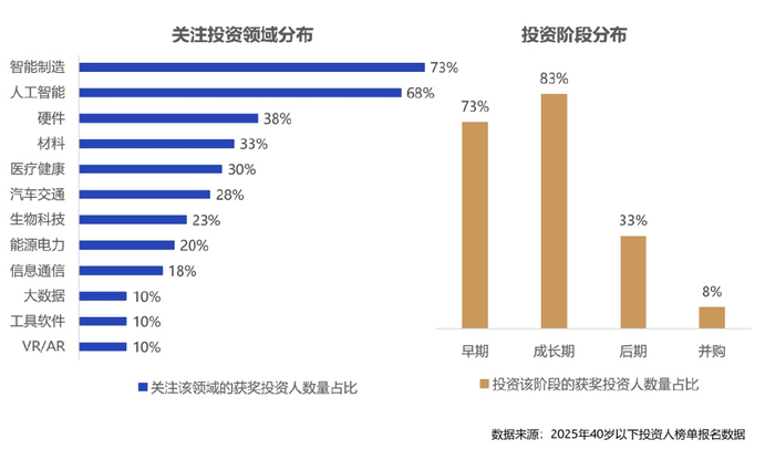 在投资阶段选择上,“投早、投小、投科技” 依然是青年投资人的核心策略,其投资组合更倾向于配置处于早期及成长期的科技企业,凸显对技术原始创新与产业转化效率的双重关注。