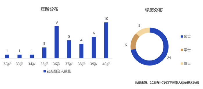 个人背景:获奖投资人平均年龄37.5岁,其中最小32岁;合伙人及以上职级者占比60%;硕士及以上学历者占比高达近九成,其中博士有5位;
