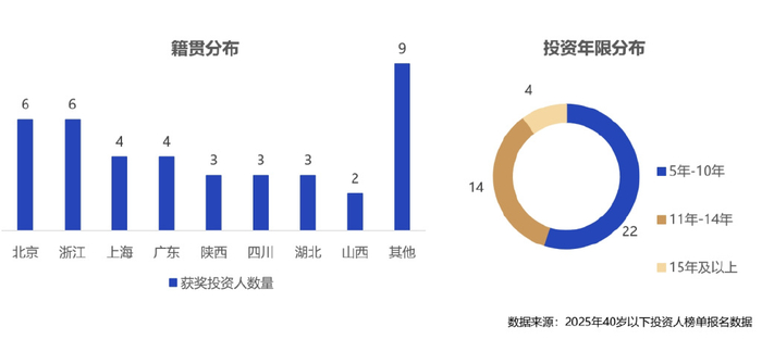 今年获奖人的籍贯分别有6位在北京和浙江,紧随其后的是上海和广东,分别有4位。投资经历方面,有22位投资人的投资年限在5-10年;有14位投资人的投资年限在11-14年;4位投资人的投资年限在15年及以上。