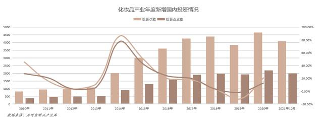 化妆品产业的年度新增融资金额增长情况与融资次数相似,在2016年达到峰值,近几年则呈现下降趋势,同时,化妆品产业投资企业数增长趋势也呈现“先增后降”趋势,在2014年增速达到最大值,超过80%,此后增速开始下降。