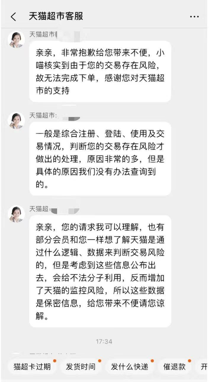 “莫名其妙被天猫超市限制购物,已经好几个月没法下单了。卡内还有数千元余额,马上就过期了,怎么办?”
