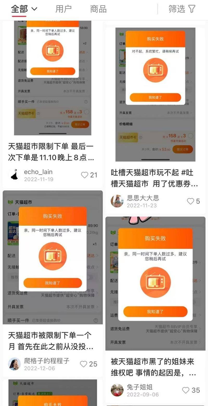 “每次结算时,都会弹窗提示我‘同一时间下单人数过多,建议稍后再试’。刚开始我以为是元旦买东西的人多,系统繁忙。可我整整试了一上午,都没法下单,后来意识到我大概率是被天猫超市‘拉黑’了。”所谓的“被拉黑”,就是消费者账户被天猫超市认定为有异常,无法继续在平台购买物品,充值卡内的余额也暂时无法使用。孙女士咨询了在线客服,客服称孙女士的账户存在风险,至于存在什么风险、为什么存在风险却并未告知,还提供了几种方法让她重新尝试下单,包括重新登录、卸载重装等。全部无效后,客服又称可过7天后再尝试。“客服还说,500多元余额不是通过天猫超市充值的不给退。”孙女士对此颇为气恼。
