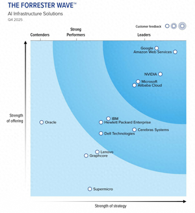 据了解,本次评估覆盖全球顶级科技企业,入选标准极为严苛,今年仅有13家最终入围。为更准确地反映在企业侧AI渗透率加速提升的背景下,基础设施如何在真实场景中有效赋能AI应用,Forrester从产品与战略两大维度、共计19项细分标准进行全面评测。其中,阿里云在配置、数据管理、模型开发、运维管理、容错能力、运行效率、部署形态、产品路线规划、价格灵活性&透明度等9项标准中斩获满分,与谷歌、AWS、英伟达、微软并列全球“领导者”阵营。