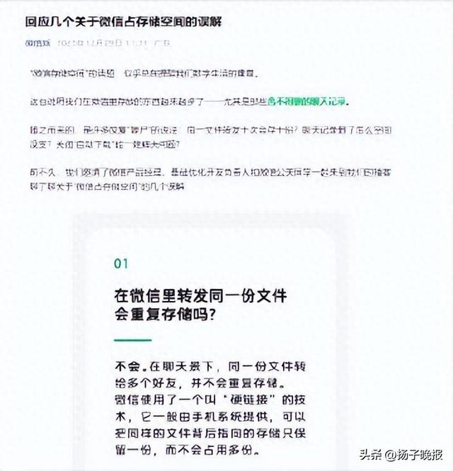 12月29日,微信团队发文,回应了多个关于微信占用存储空间的误解,其中辟谣了网络上流传已久的微信占用手机存储空间特别大是因为微信会对同一文件多次重复存储。微信采用“硬链接”技术,同一份文件无论转发给多少好友,都只保存一份,不会占用多份。