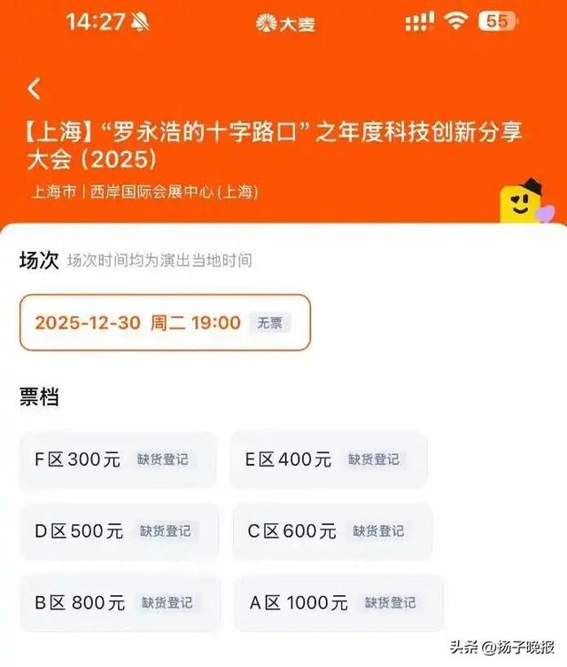 大麦APP截图12月22日午间,“罗永浩的十字路口”年度科技创新分享大会正式开售。此次大会门票分为300元、400元、500元、600元、800元、1000元6档,服务说明显示:不支持退票、实名制购票和入场、不支持选座。
