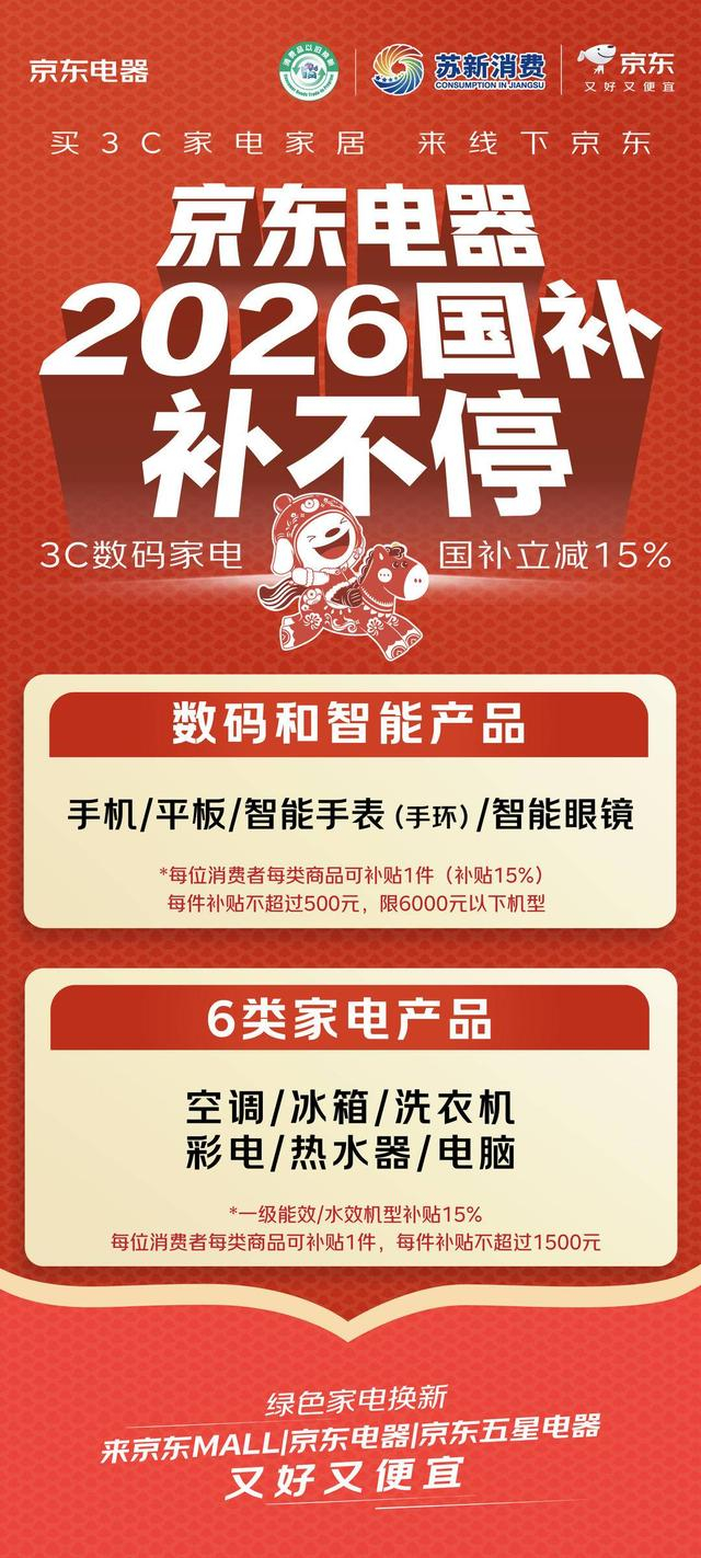 京东电器表示,国补与京东门店的厂商补贴、以旧换新补贴等优惠兼得,让老百姓真正得实惠,促进绿色智能电器走入千家万户。随着2026年国补持续开展,京东MALL、京东电器将进一步优化服务,通过线上线下联动、场景化体验升级等方式,助力消费者畅享智能生活。