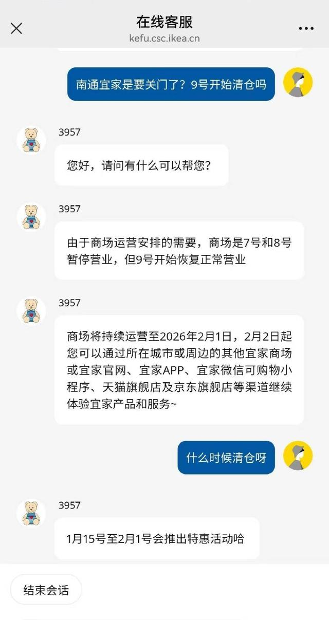 不少网友猜测,宜家南通门店后续将会进行打折清仓活动,扬子晚报/紫牛新闻记者咨询线上客服,这名客服回应称将于1月15日至2月1日推出特惠活动。