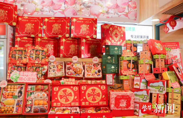 随着这届年轻人对于国潮和非遗的拥趸,商家们也开始琢磨更符合这届年货主理人审美喜好的商品形式。记者在百果园门店看到,今年其品牌携手国家级非物质文化遗产杨家埠木版年画代表性传承人杨乃东,以“百果画福年,马上好运连”为主题,上新的春节水果礼盒颇为喜庆。礼盒以杨乃东创作的马年主题木版年画为核心视觉,“好事成双”为10斤装双层抽屉式礼盒,“福来运转”礼盒还内置互动游戏转盘。百果园相关负责人表示,希望借助年画这一集体记忆媒介,为水果健康年礼注入更浓郁的新春祝福与情感温度,传递“送水果不仅是送健康,更是送好运”的节日寓意。