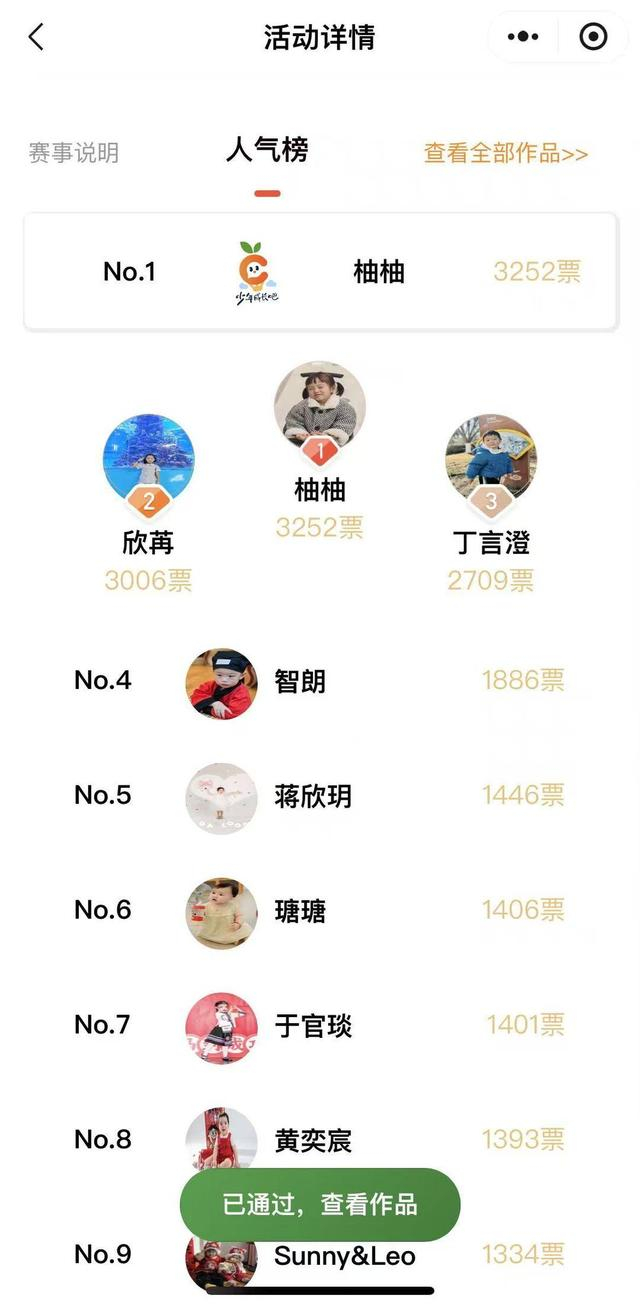随着“马上闪耀”扬子晚报马年封面宝贝征集活动进入冲刺期,活动人气榜单也频繁发生变化,选手们的人气值在你追我赶间交替上升。截至记者发稿时,柚柚宝贝暂时冲上人气榜首,记者注意到,柚柚是今年封面宝贝征集活动首位报名参与的选手,一号选手登上人气榜一号位,这背后还少不了亲友团的组团“助力”。