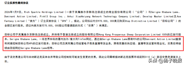无语哥知名表情包 / 图源网络2026年1月,美股上市公司Rich Sparkle宣布完成对Step Distinctive的收购。该目标公司经营电子商务直播带货业务,由无语哥直接或间接持股49%,安徽小黑羊网络科技有限公司持股13%。天眼查信息显示,安徽小黑羊的控股股东为合肥领头羊文化传媒有限公司,该公司最终受益人系张庆杨、张开杨。