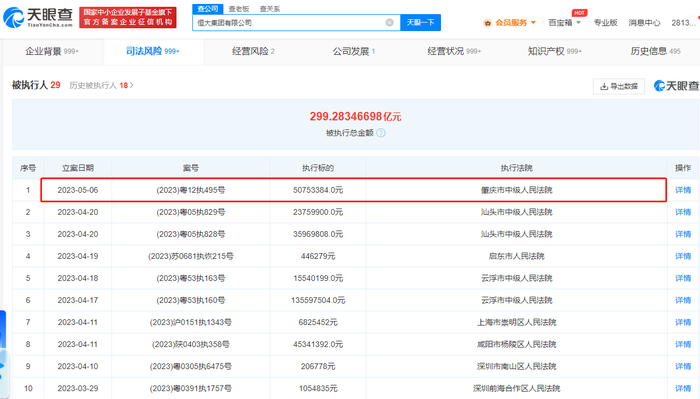 天眼查App显示,近日,恒大集团有限公司及其旗下恒大地产集团有限公司、肇庆国声镭射技术制作有限公司新增一则被执行人信息,执行标的5075万余元,执行法院为肇庆市中级人民法院。