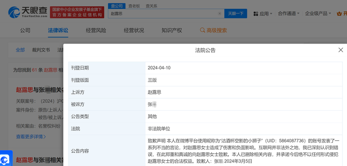 天眼查法律诉讼信息显示,近日,法院公告张某向赵露思致歉的声明。内容显示,张某在其微博账号发表了一系列不当的言论,对赵露思造成了伤害和负面影响。张某已深刻认识到错误,郑重向赵露思致歉,已删除相关内容,并承诺今后绝不以任何形式侵犯赵露思的合法权益。