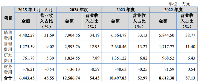 报告期内,公司期间费用总额分别为8,612.38万元、10,497.83万元、12,586.74万元和6,443.45万元,占营业收入的比重分别为57.13%、52.97%、54.43%和45.55%。公司经过前期多年的研发积累及市场推广,多项产品上市并实现收入的快速增长,公司期间费用总额亦有所增长,报告期内总体期间费用率较为稳定。