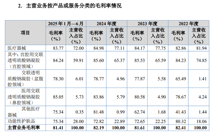 报告期内,公司主营业务毛利率分别为82.41%、81.61%、82.19%和81.41%,整体保持稳定。报告期内,交联透明质酸钠凝胶(盆腹腔领域)产品毛利率分别为65.49%、77.87%、78.77%和78.30%,整体呈上涨趋势,主要系该产品销售规模持续增长,规模效应显现,单位成本下降,毛利率不断提升。