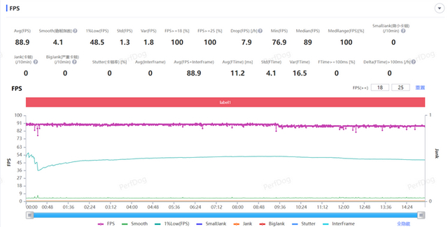随着游戏的进行,9分钟过后帧率被锁定在了88FPS,使得整体平均帧率未能达到90FPS的最高水平,最终平均帧率为88.9FPS。