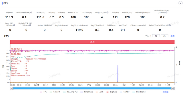 《王者荣耀》手游测试,可在120FPS模式下开启高清画质,一局5V5对战下来平均帧率稳定在119.9FPS。