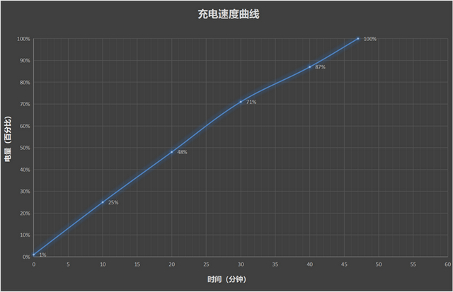 首先是充电测试,手机电量从1%开始灭屏测试,10分钟电量达到25%,20分钟电量来到48%,半小时电量充至71%,最终完全充满用时47分钟。