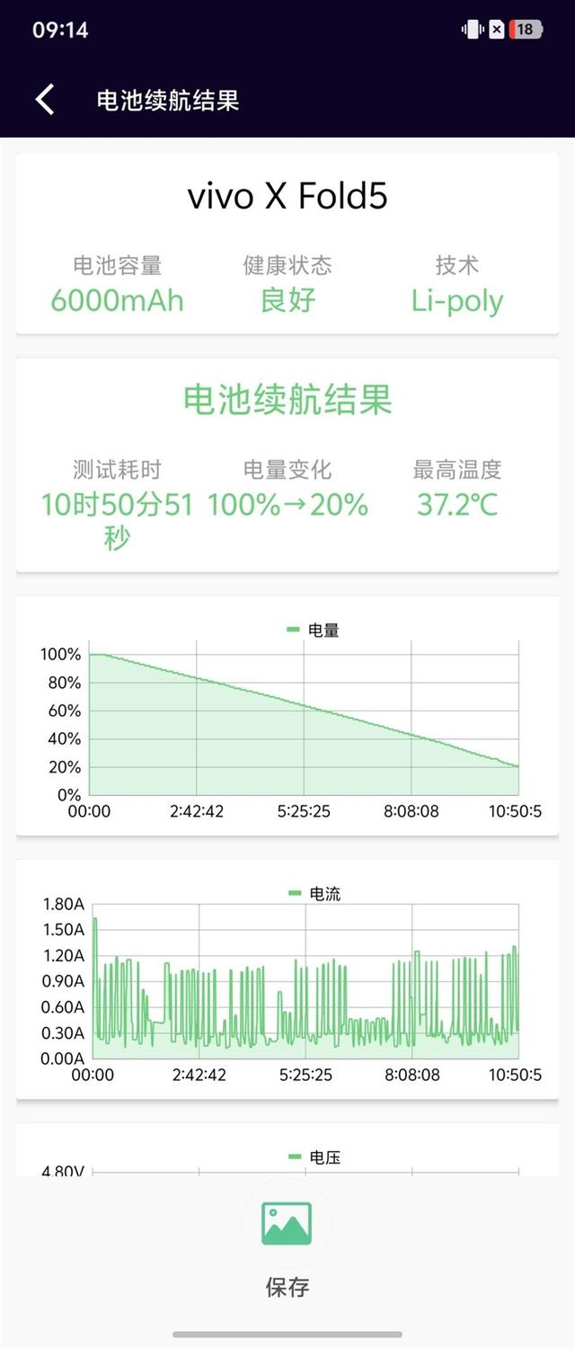 按照消耗电量的速度进行折算,vivo X Fold5的外屏综合续航时间大约在13个小时左右,6000mAh的大容量电池,相比去年X Fold3的5700mAh整体续航多出了约4个小时。