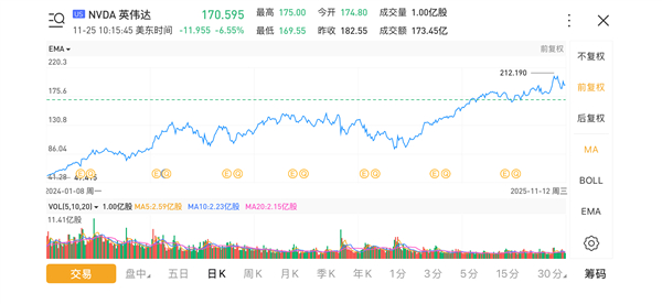 其总市值跌至4.15万亿美元,较历史最高点跌去1万亿美元,10月29日,英伟达股价一度触及212美元/股的最高点,当时总市值高达5.15万亿美元。