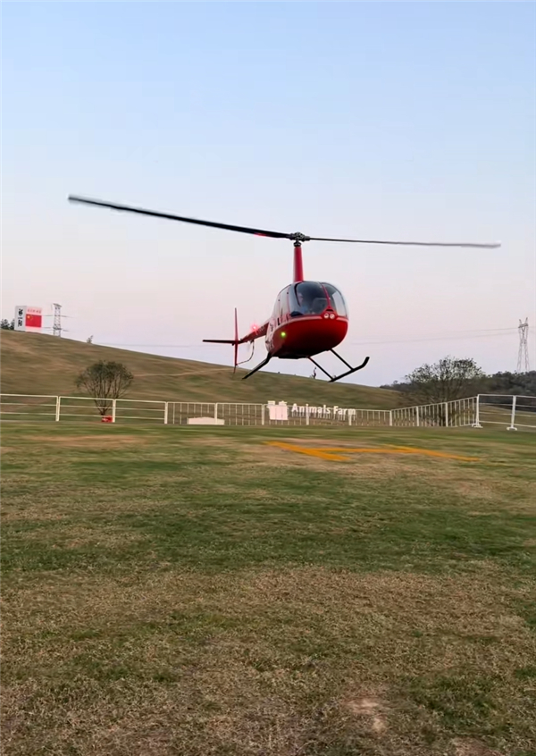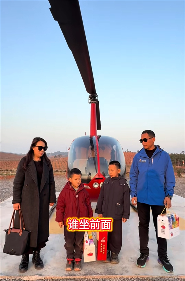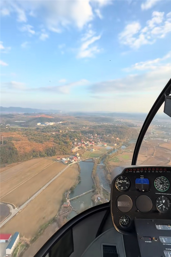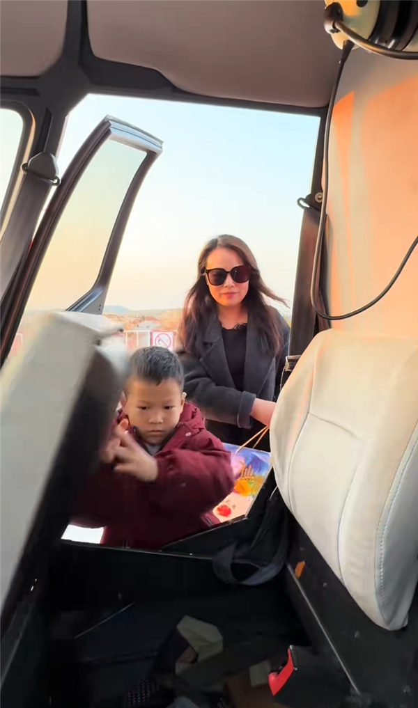 当事博主在短视频平台发布的视频显示,他们一家四口,由他驾驶着罗宾逊R44型直升机一起返回80公里外的老家,去和孩子的爷爷过元旦。