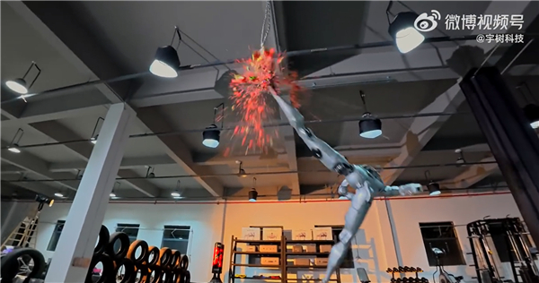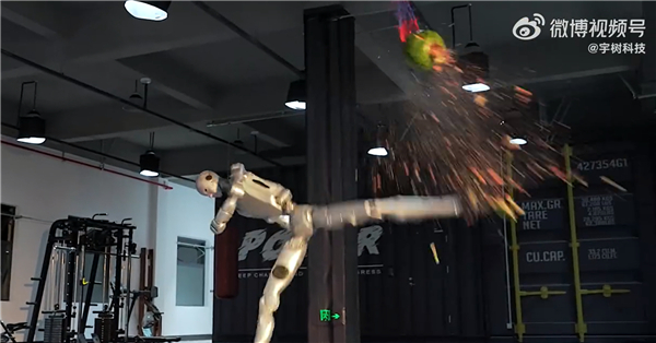 随后,机器人在空中展示了回旋踢,轻松将吊起来的西瓜踢得粉碎。不仅如此,还一脚将两个60公斤沙包踹开,并且稳稳站住。