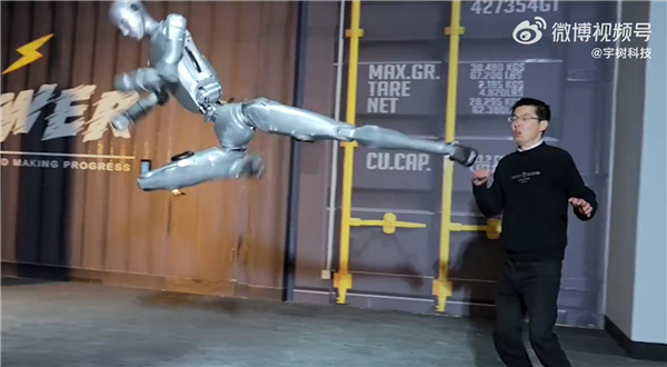 视频中,机器人先是表演了空中横踢,宇树科技CEO王兴兴连连后退,闪躲过飞踢。