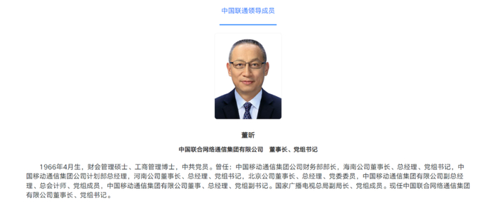 此前11月19日,中国联合网络通信集团有限公司召开中层以上管理人员大会。中央组织部有关负责同志宣布了党中央关于中国联合网络通信集团有限公司主要负责同志调整的决定:董昕任中国联合网络通信集团有限公司董事长、党组书记。相关职务任免按有关法律和章程的规定办理。