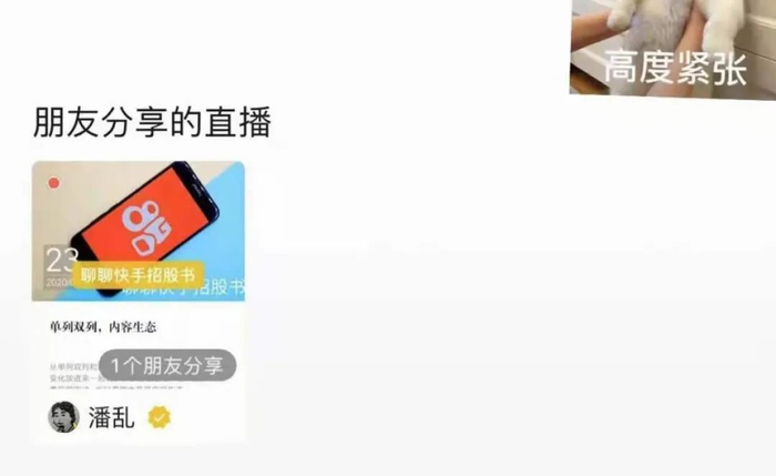 第二次是快手发招股书那晚,朋友圈置顶朋友分享的直播。(后来因为用户体验问题,这个位置被用户吐槽上热搜后暂时下了)