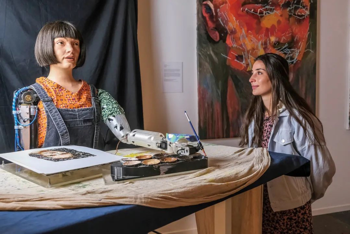 2022年4月19日,在意大利的威尼斯双年展上,观众正在观看机器人艺术家 Ai-Da 作画。(图/视觉中国)