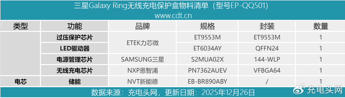 最后附上三星Galaxy Ring无线充电保护盒的核心器件清单,方便大家查阅。