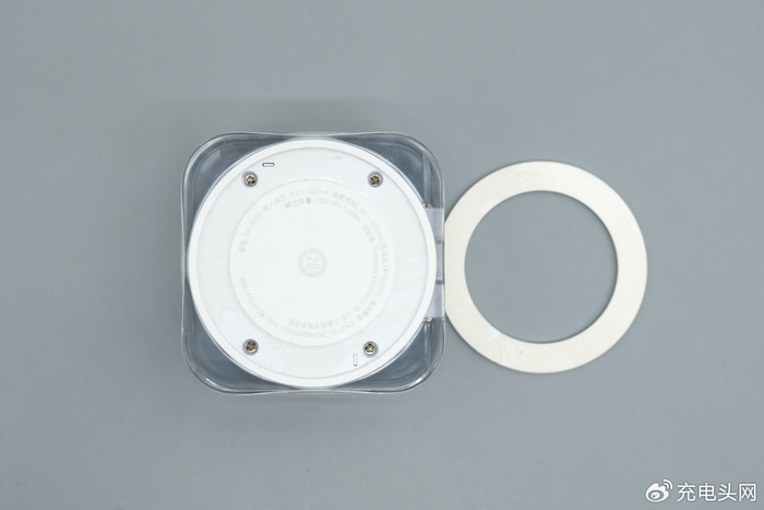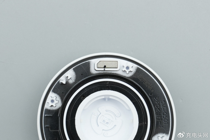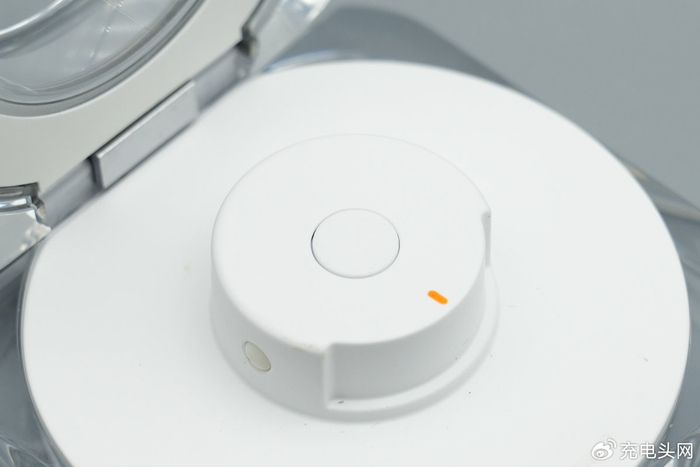 此外底座上还设有盖板和戒指无线充电支架组成的一体式模块。支架顶部中心设有多功能按键,边缘印有提示戒指对齐放置的标记,此外侧身设有辅助固定戒指的球状凸起。