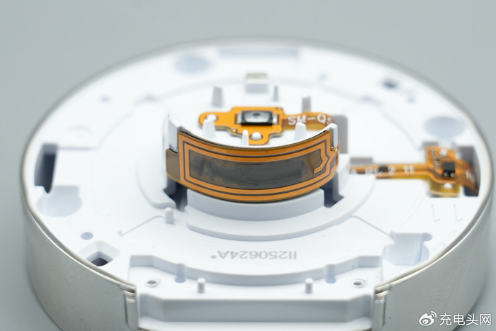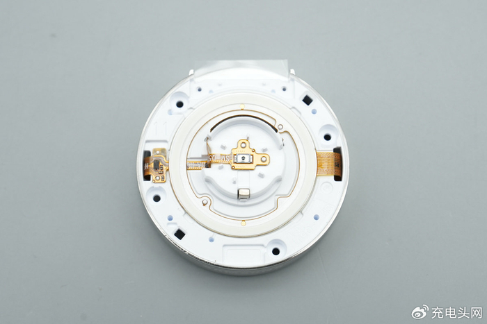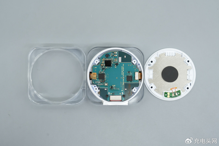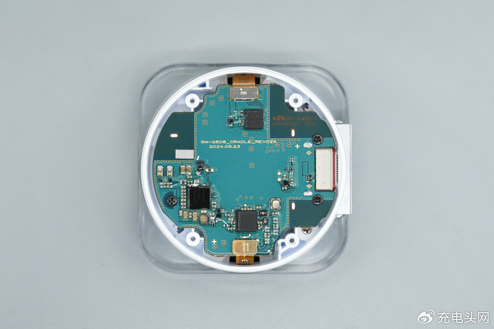 内部主控PCB板也是使用螺丝进行固定,指示灯板以及戒指无线充电支架线圈均采用排线插拔式连接PCB板。