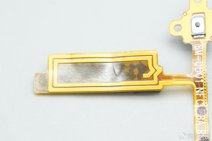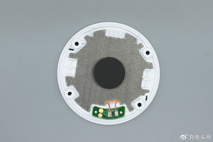 盖板上贴有无线充电线圈,线圈与独立小板锡焊,再通过小板与主控PCB板接触连通。此外线圈背面设有金属板和保护垫。