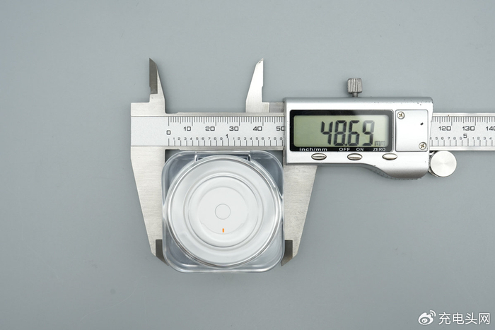机身底部贴有防滑胶垫圈,外壳上印有充电盒的参数信息。