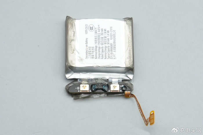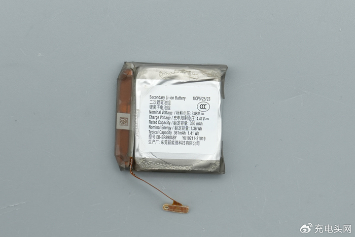 电芯另一面贴有参数贴纸,电芯型号为EB-BR890ABY,标称电压3.88V,充电限制电压4.47V,额定容量350mAh,额定能量1.36Wh,典型容量361mAh 1.41Wh,生产厂为东莞新能德科技有限公司。