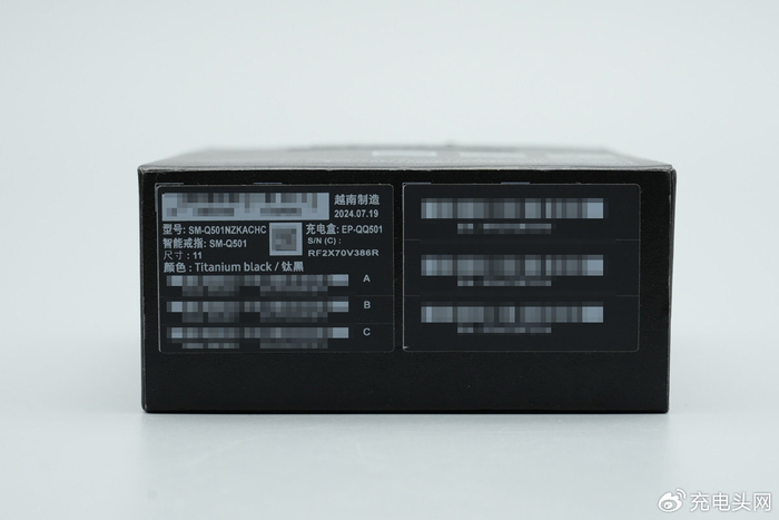 侧面贴纸上是戒指、充电盒的型号、尺寸、配色以及生产日期等信息。