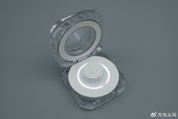 无线充电保护盒为方块造型设计,主体采用亚克力材质打造,整体晶莹透亮,质感十足。