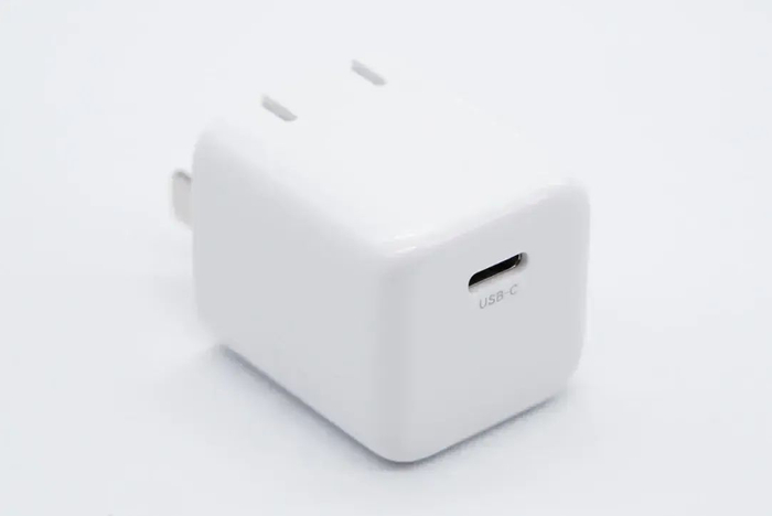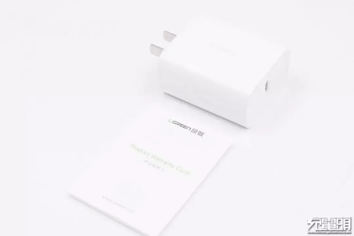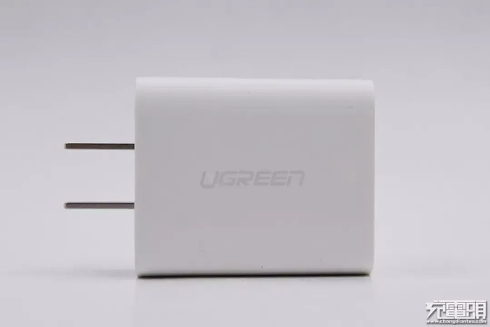 绿联18W MFi快充套装里面的充电器为纯白色外观,采用PC阻燃材质,表面亮面处理,采用可折叠的插脚设计,方便收纳、携带。