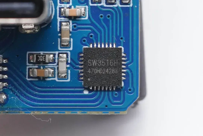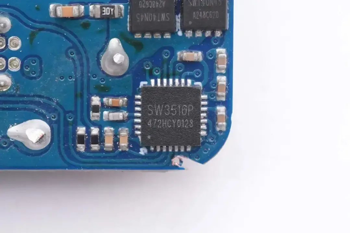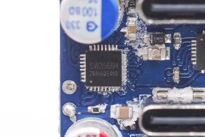 充电器内置智融SW3516H用于降压控制和协议识别,这是一款高集成度的多快充协议双口充电芯片,支持A+C口任意口快充输出,支持双口独立限流。